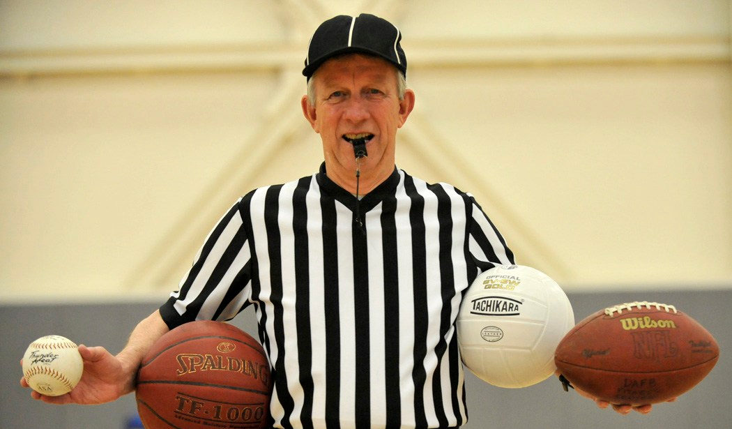 John Darcey, lead official for intramural sports, stands ready to officiate no matter what the sport at the fitness center April 12, 2012, Dover Air Force Base, Del. Darcey, who is a retired Chief Master Sgt., has been officiating football, basketball, volleyball and umpiring softball at Dover since 1992. (U.S. Air Force photo by Tech. Sgt. Chuck Walker)